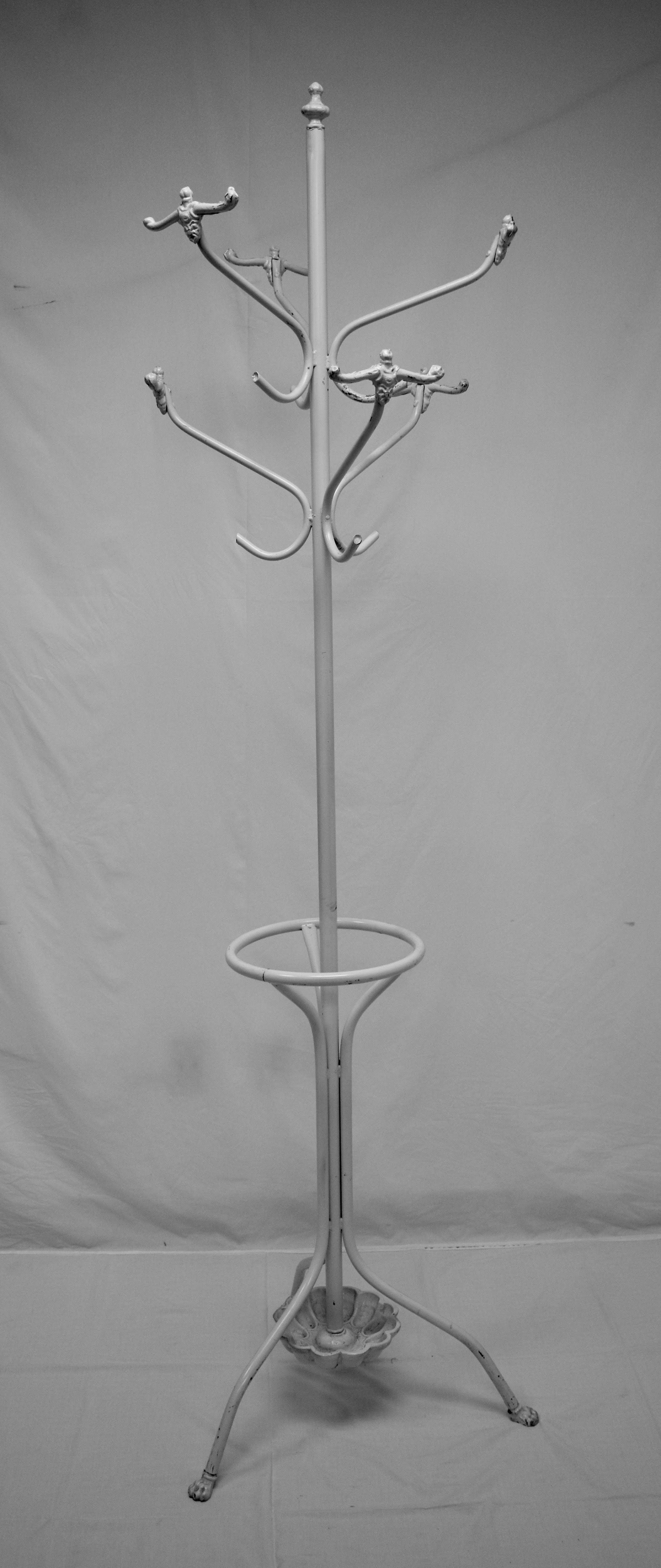 All wood surfaces are reclaimed with oak veneers. 5 out of 5 stars. 5 out of 5 stars. This piece features 16 decorative scrolled hooks and umbrella rack, a durable metal construction and an elegant, wrought iron composition. Large antique 19th century victorian wrought cast iron hall tree coat stand.